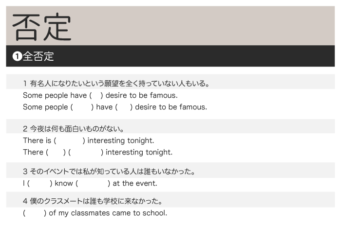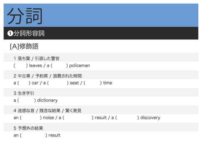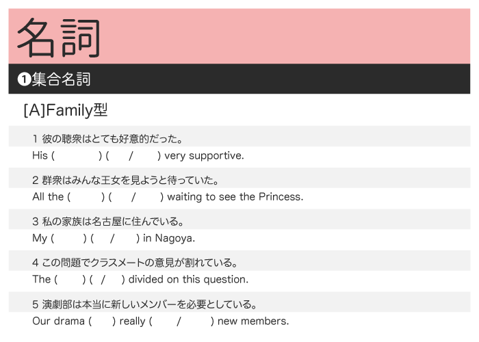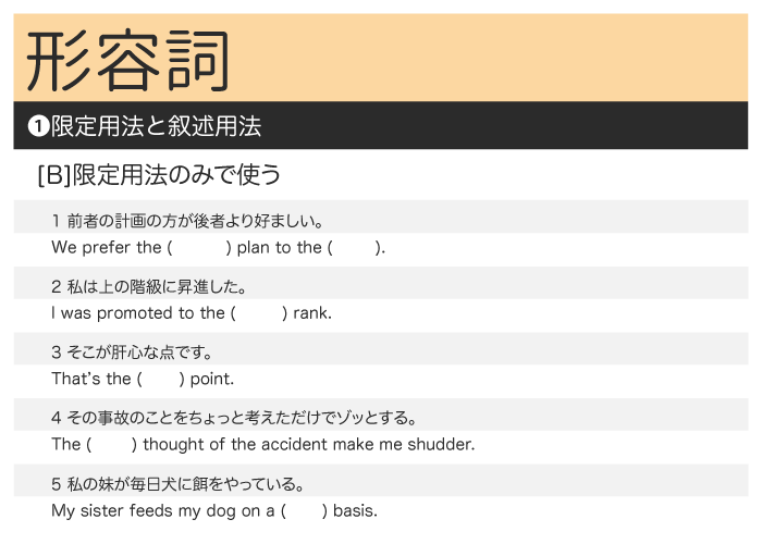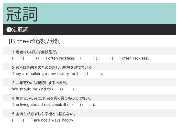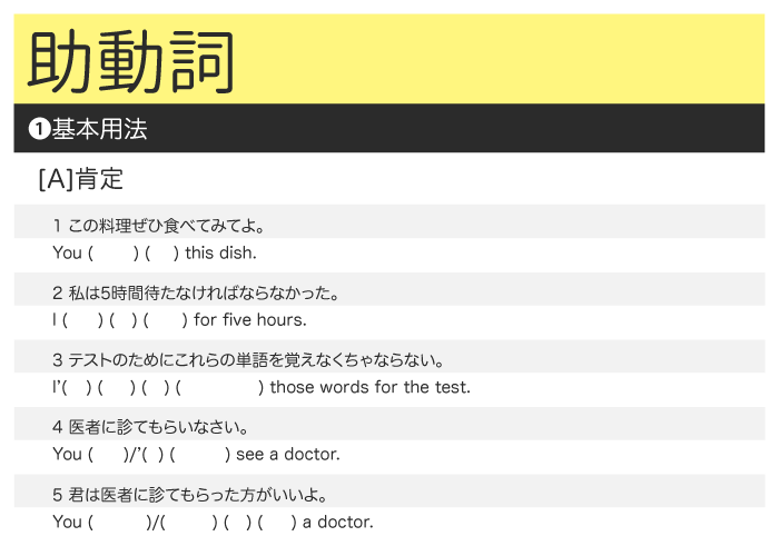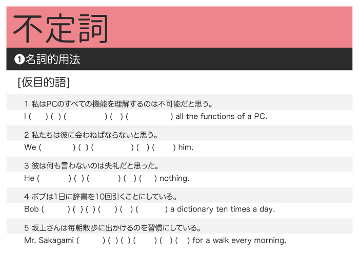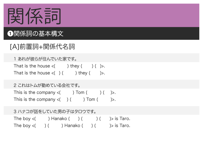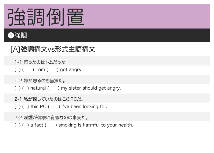 文型 状態動詞 助動詞 受動態 不定詞 動名詞 分詞 比較 関係詞 仮定法 名詞 冠詞 代名詞 形容詞 副詞 D.M 否定 強調倒置 接続詞 無生物 同格